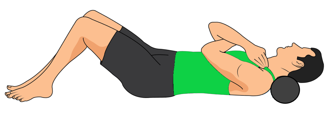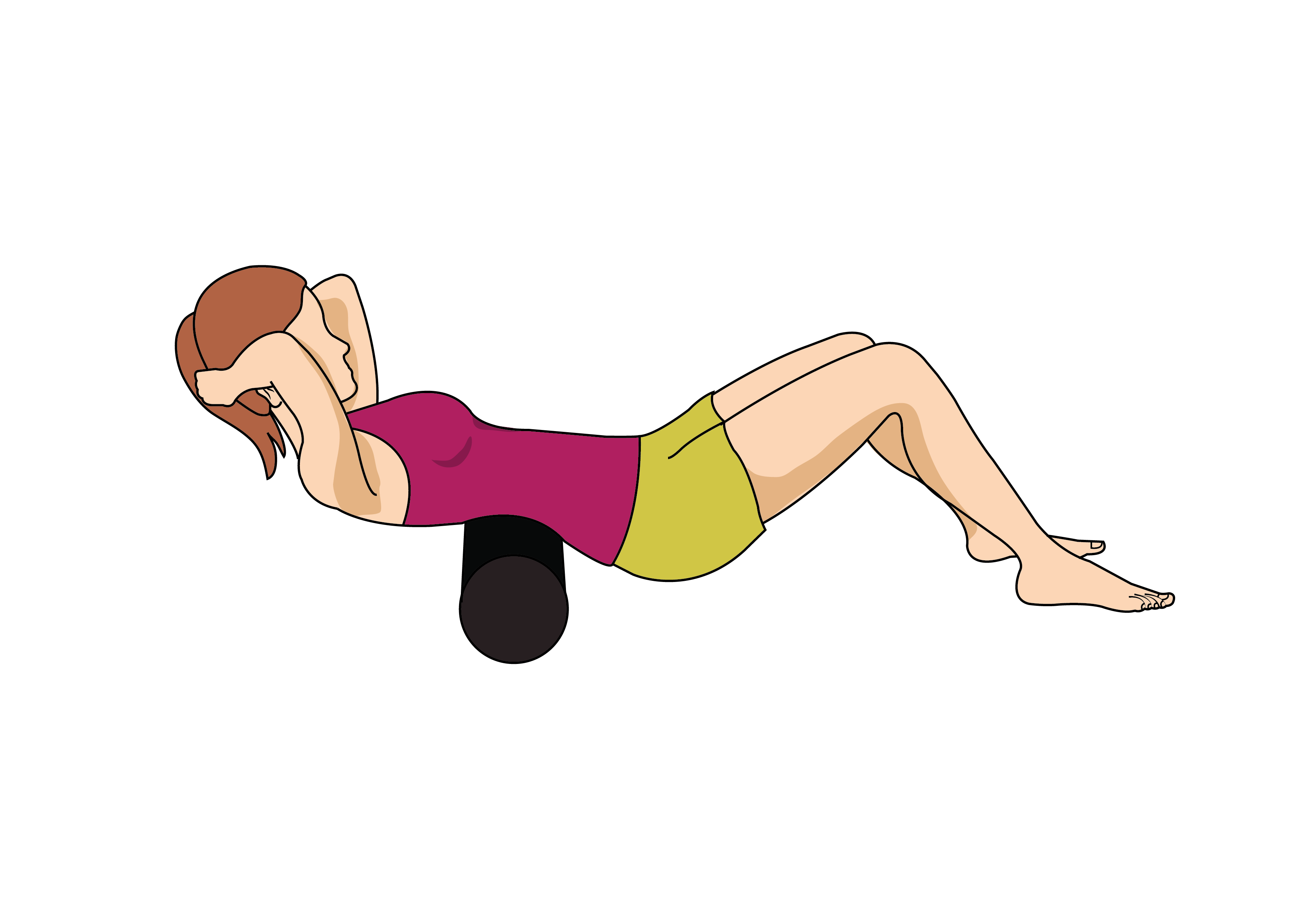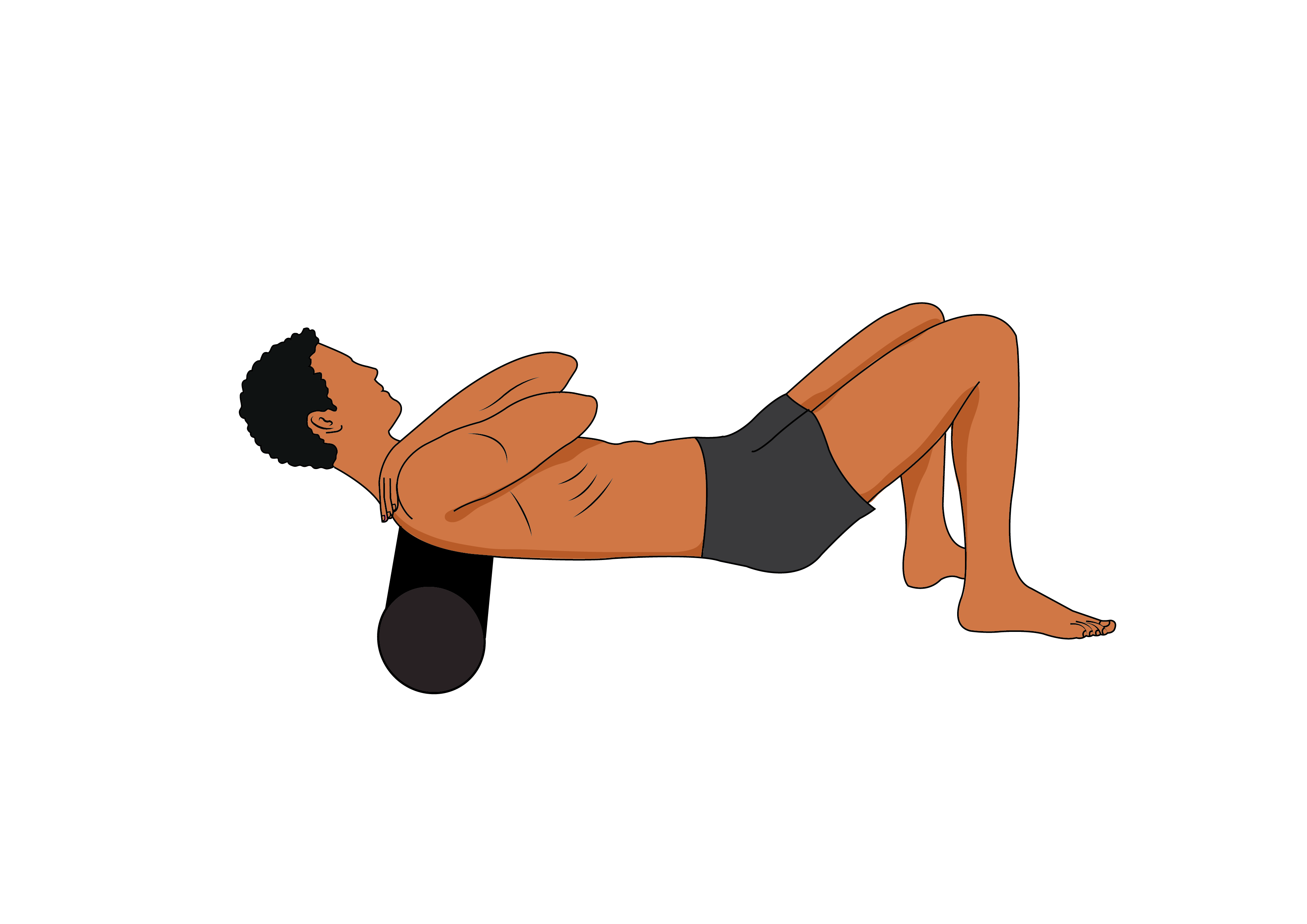 Place the foam roller under your upper back, bend your legs and straighten your arms. Press your feet and hands into the ground and lift your buttocks off the floor, coming up into Bridge Pose. Shift your body forward and backward while the roller massages your upper back.