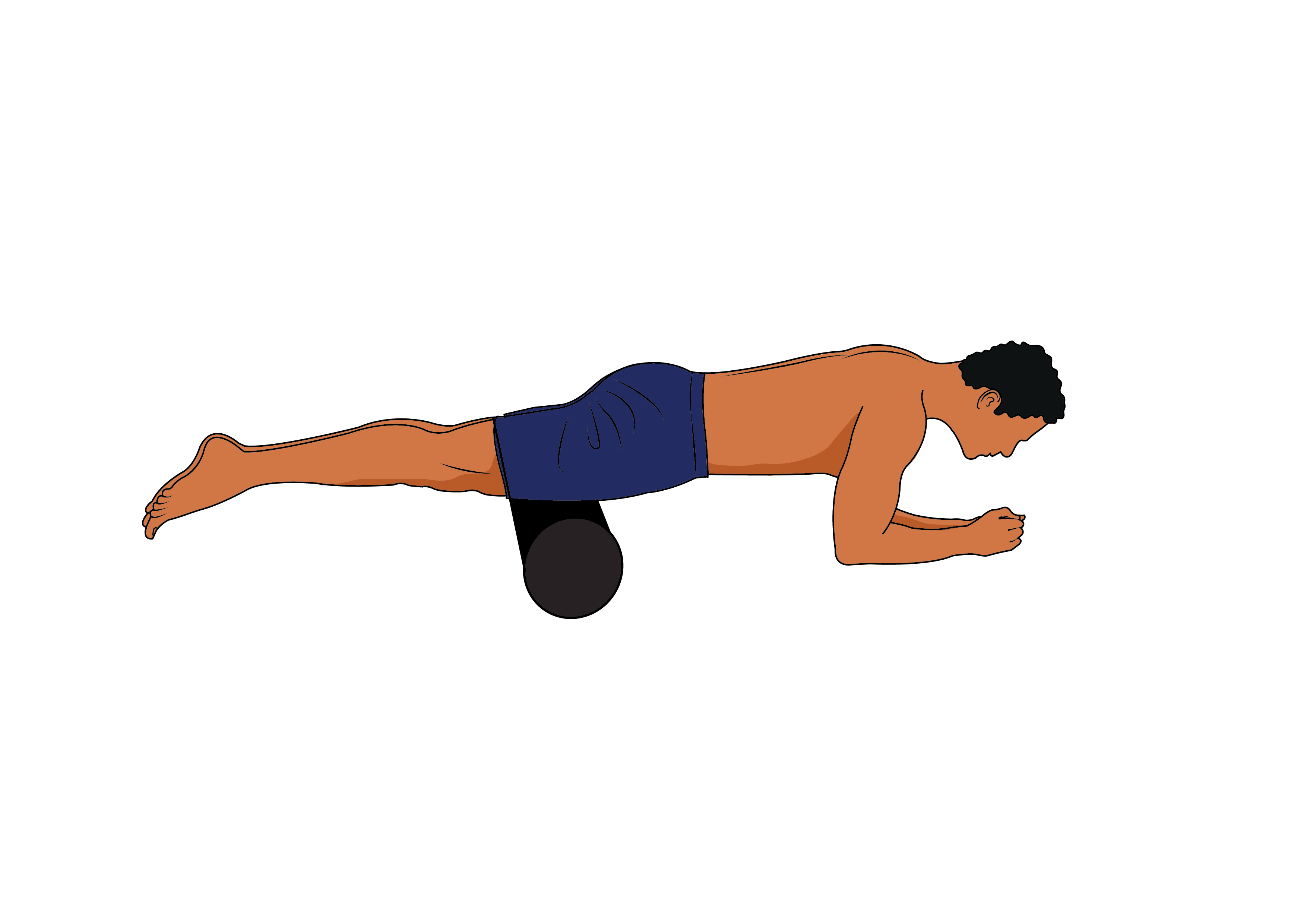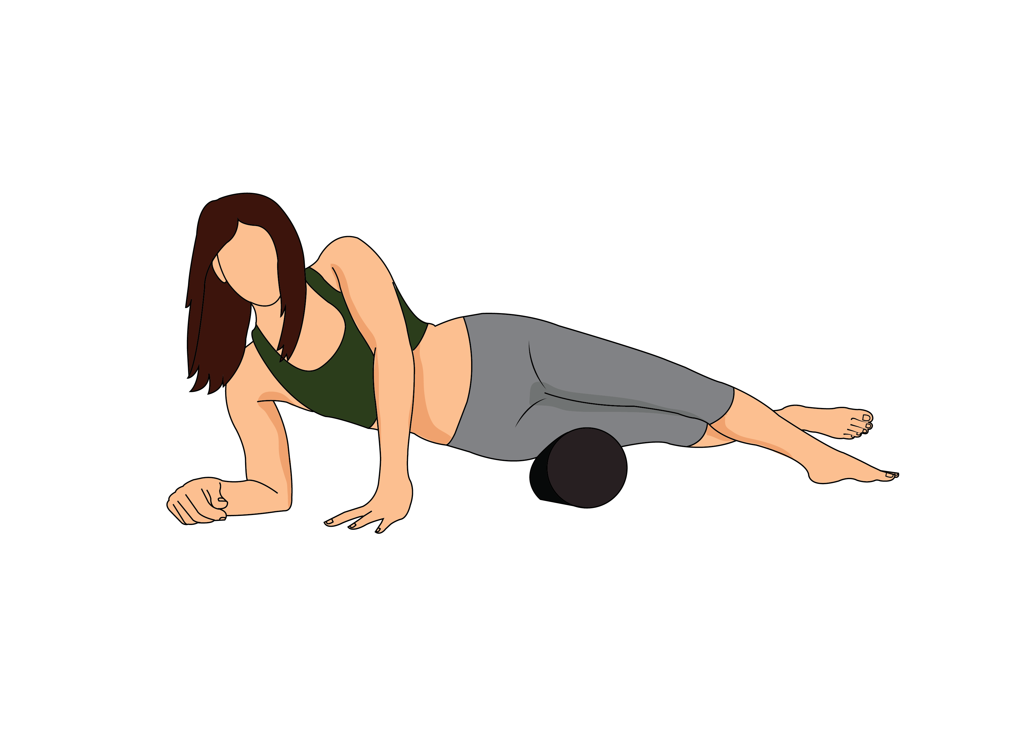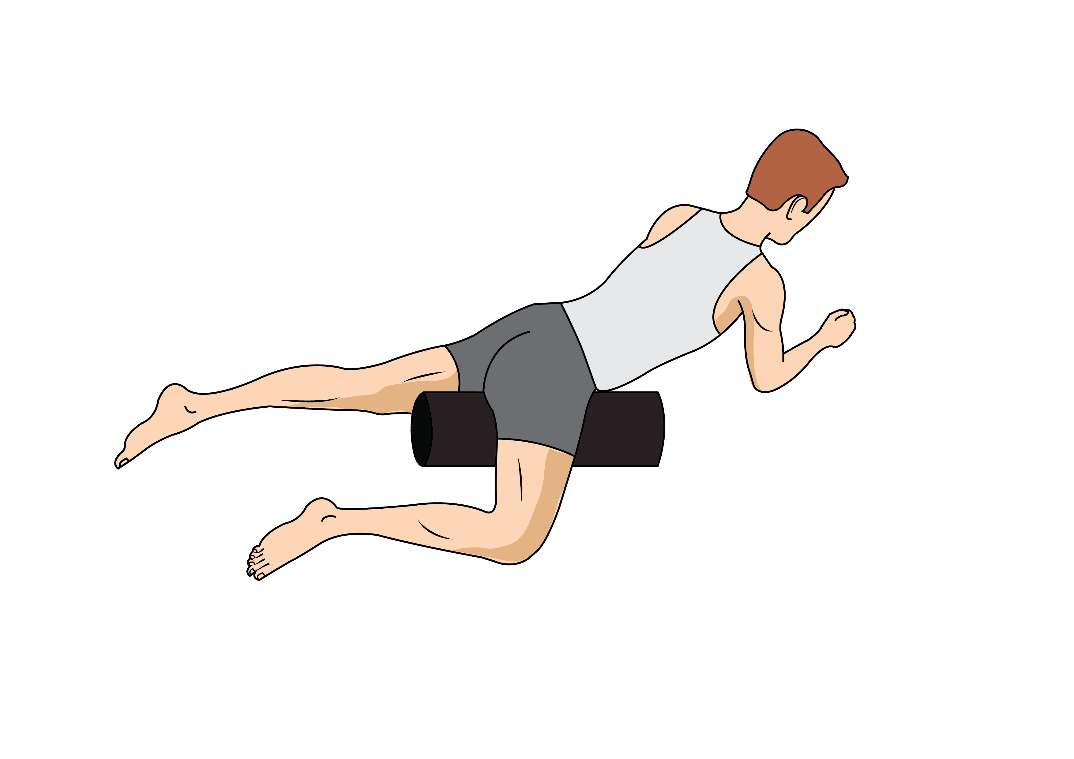 Lay on your stomach and place the roller under one hip, spreading your legs outward. Start at your hip and work down to the knee. If you find a tender spot, push down and hold, or roll quickly back and forth over the tender spot. Make sure to switch sides after about a minute.