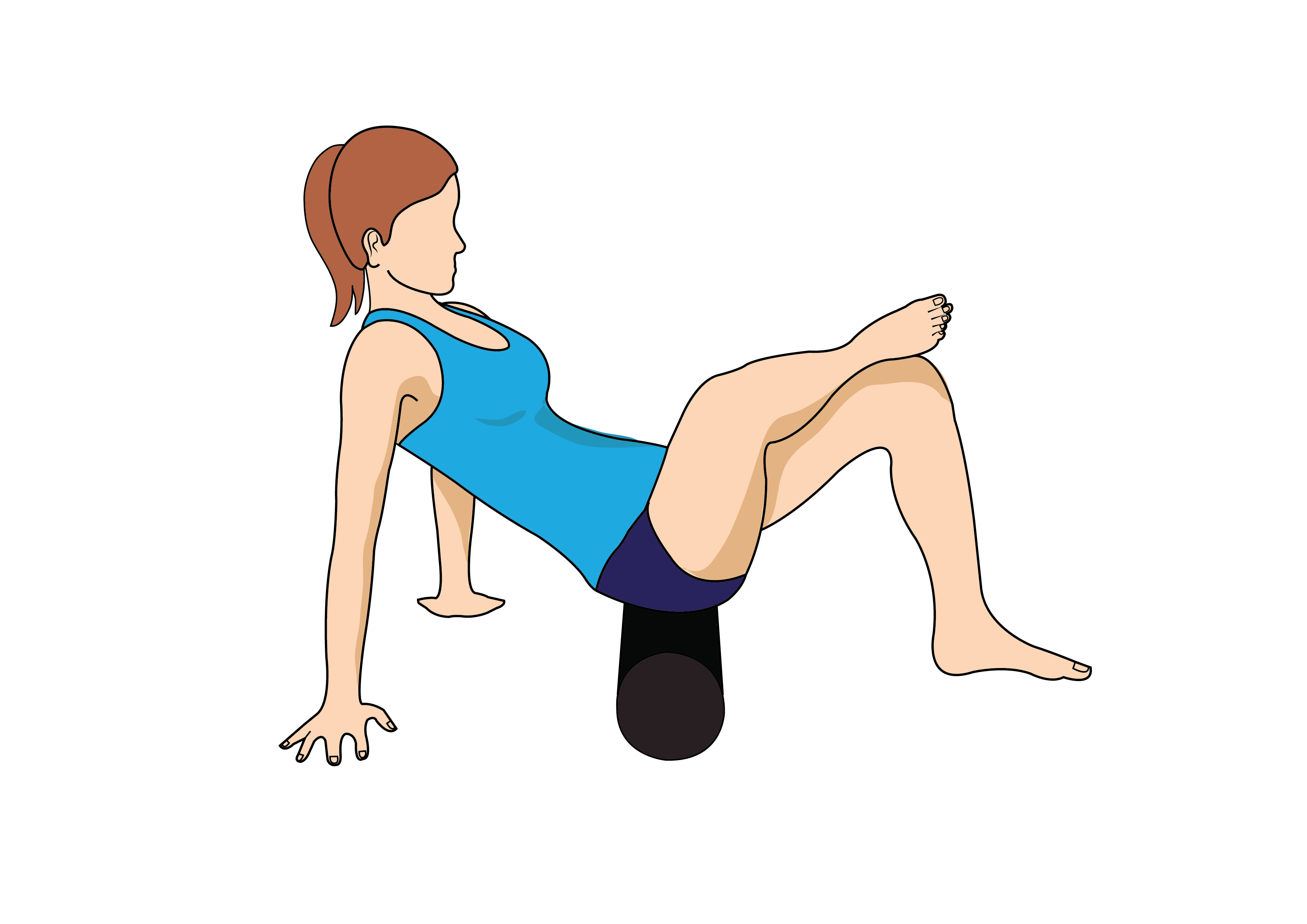 To release tension in the glutes, place the roller under your buttocks. Bend your legs, placing your feet flat on the floor. Shift your body forward and backward while rolling the roller across your buttocks.