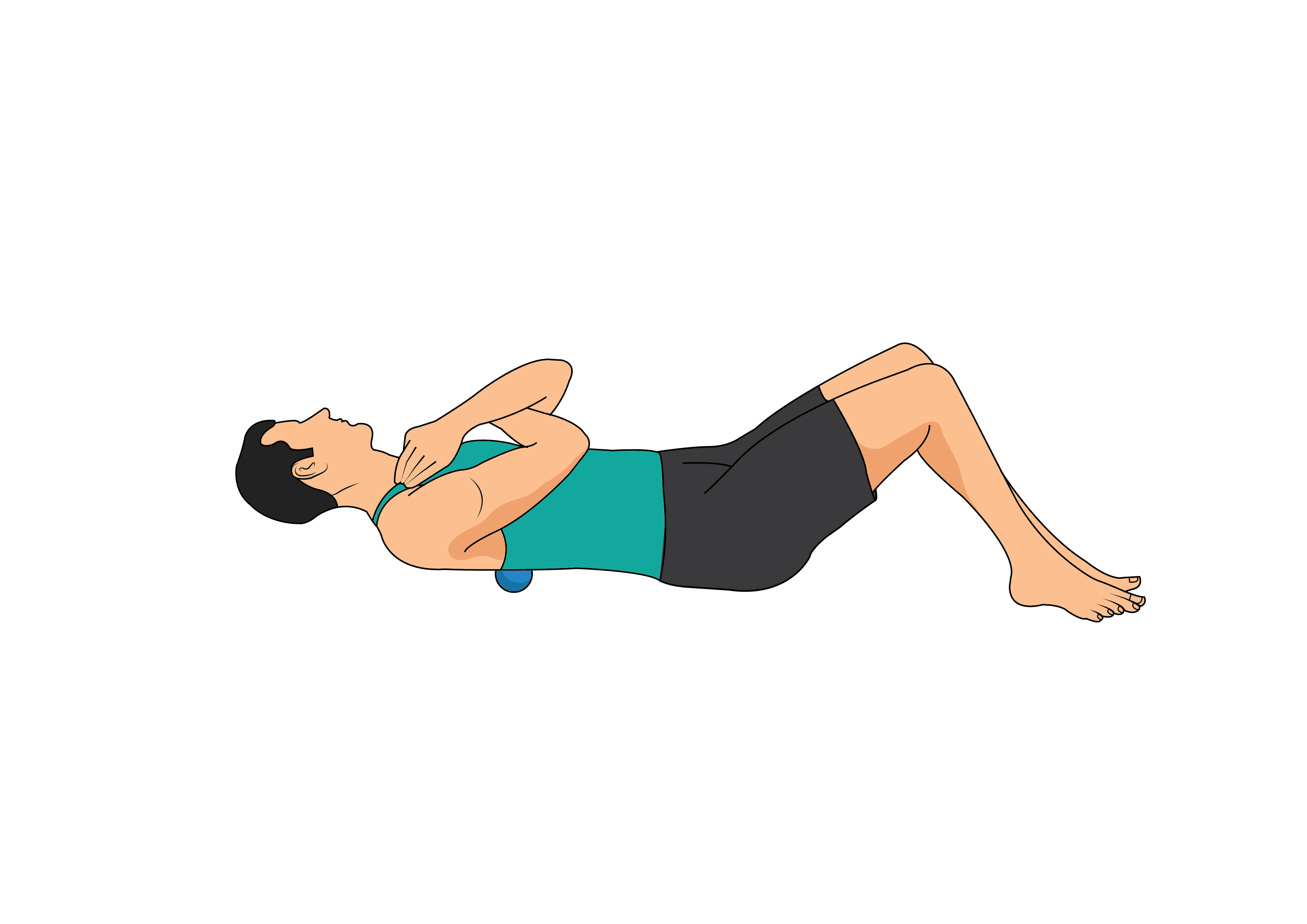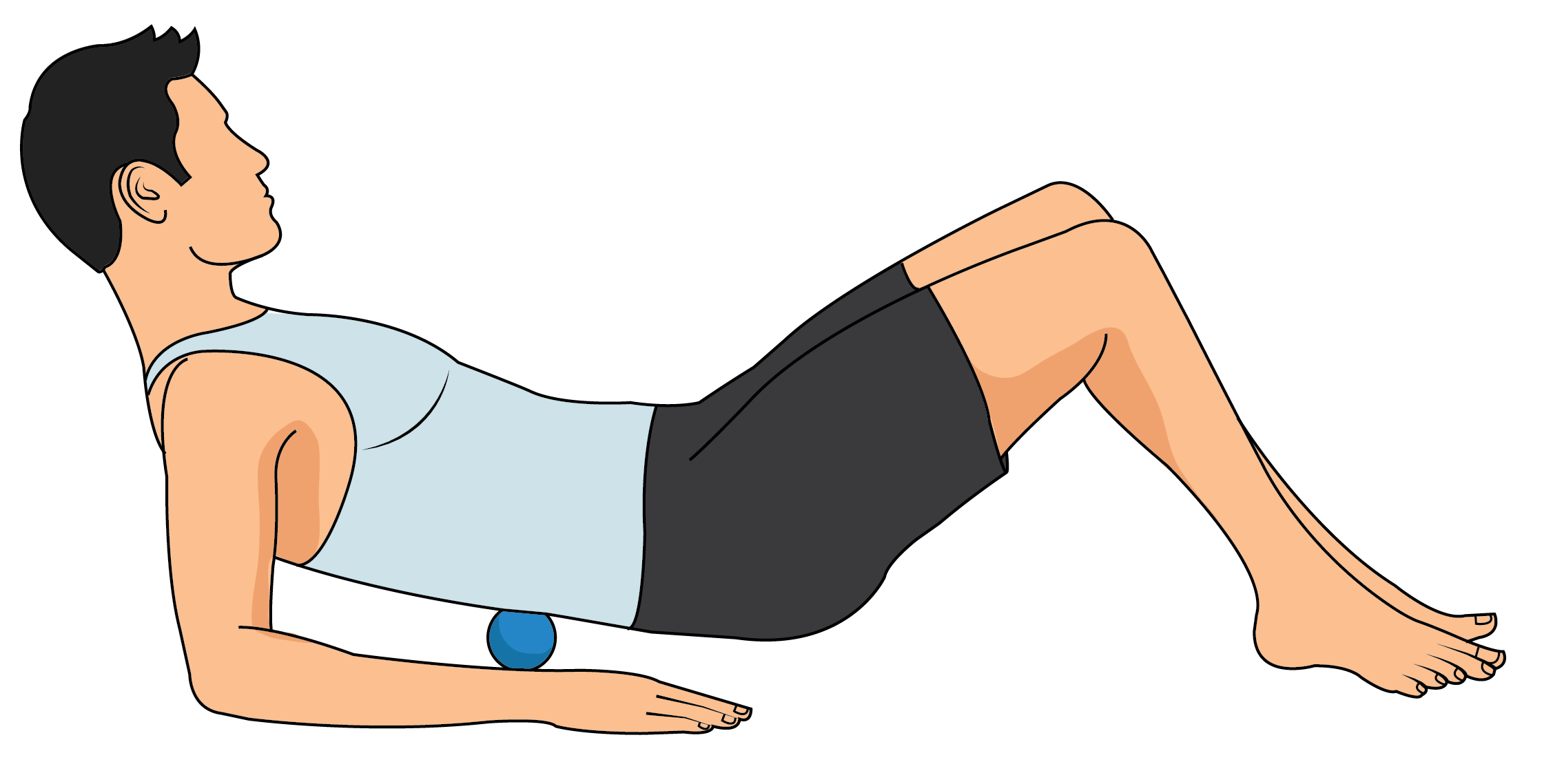Place the peanut massage ball horizontally midway down your back. Then, roll up and down by pushing into the ground with your heels while using your forearms against the ground to the sides of your body in order to stabilize yourself.