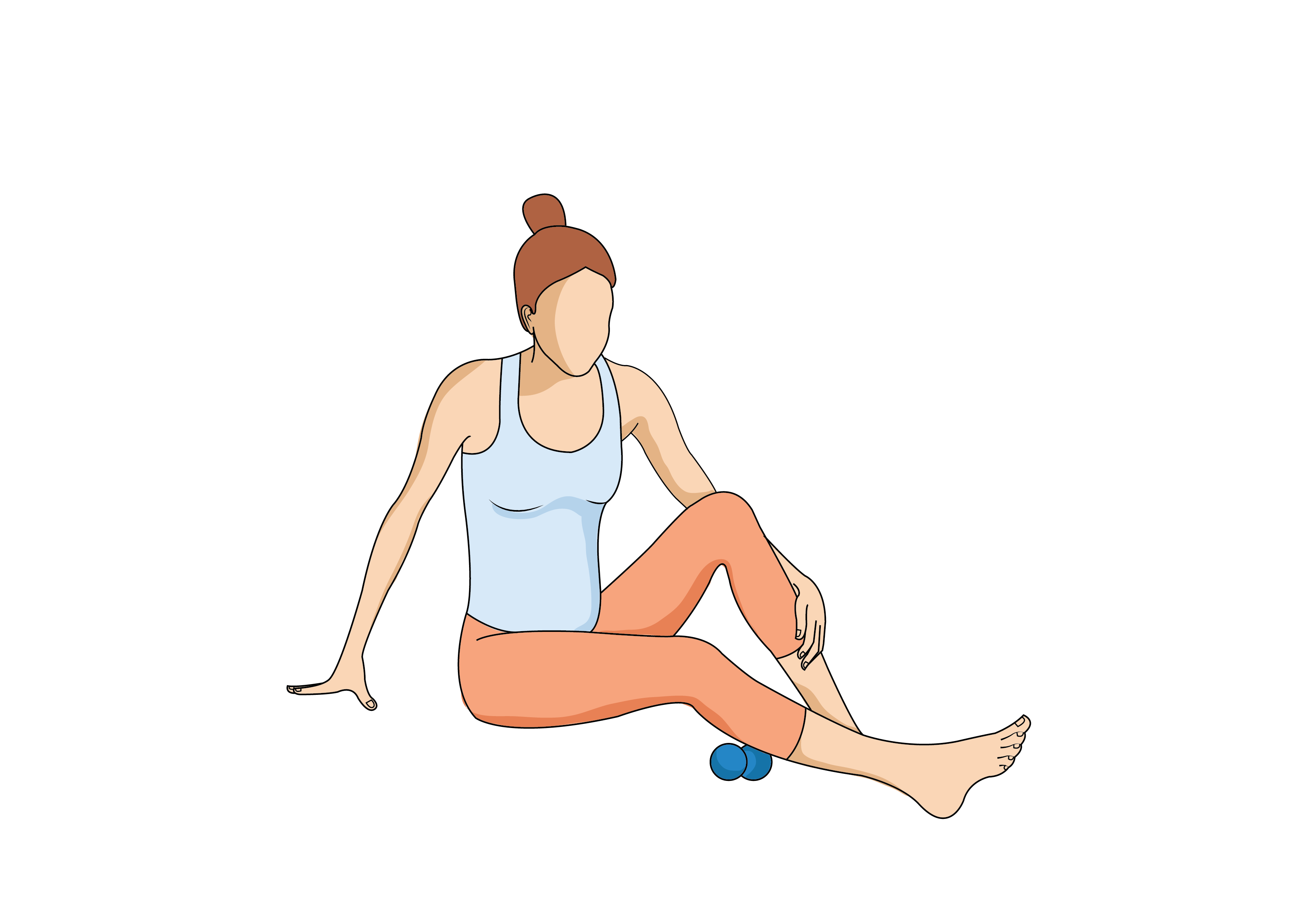 Sit on the ground with your knees bent, feet on the floor in front of you. Put your hands down on the floor behind you for support. Then put the massage ball under your left glute. Push off the ground with your hands and roll around until you find the sore spot and keep this position until you massage away the pain.